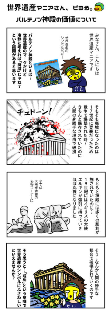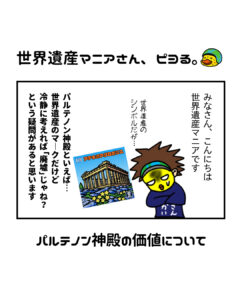 世界遺産マニアさん、ピヨる「パルテノン神殿の価値について」 2026 4/05 世界遺産マンガ 漫画 ギリシャ ギリシャ(遺跡) 遺跡 URLをコピーしました!これは…最も世界遺産らしい世界遺産なのかもしれない 世界遺産マンガ 漫画 ギリシャ ギリシャ(遺跡) 遺跡 この記事が気に入ったら いいね または フォローしてね! Follow @sekaiisan_mania Follow Me URLをコピーしました! この記事を書いた人 世界遺産マニア(の中の人) 世界遺産マイスター|WHA認定講師 世界遺産一筋20年以上!遺跡を求めて世界を縦横無尽で駆け抜ける、生粋の世界遺産マニアです。そんな「世界遺産マニア」が運営するこちらのサイトは1200以上もある遺産の徹底紹介からおもしろネタまで語り尽くし、漫画からオリジナルシールまで制作・公開しています。 関連記事 レバノンの世界遺産「バールベック」とは?世界遺産マニアが解説 2022年10月16日 イスラエルの世界遺産「人類の進化を示すカルメル山の遺跡群:ナハル・メアロット(ワディ・エル=ムガーラ)の洞窟群」とは?世界遺産マニアが解説 2022年11月4日 世界遺産に登録されているインドの遺跡はいくつある?それぞれを一覧にして世界遺産マニアが解説 2024年5月23日 イタリアの世界遺産「アグリジェントの考古的地域(神殿の谷)」とは?世界遺産マニアが解説 2022年10月27日 ドイツの世界遺産「ロルシュの修道院とアルテンミュンスター」とは?世界遺産マニアが解説 2023年3月30日 スリランカの世界遺産「聖地キャンディ」とは?世界遺産マニアが解説 2022年4月30日 4コママンガ「ツタンカーメンさんは死ねない。」私の義母について 2025年11月5日 青森県の世界遺産「三内丸山遺跡」とは?世界遺産マニアが解説 2024年3月26日