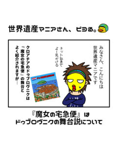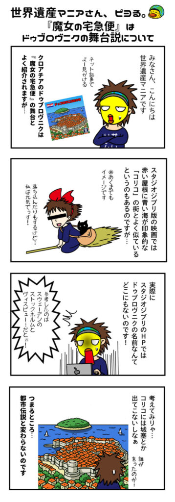4コママンガ「世界遺産マニアさん、ピヨる。」『魔女の宅急便』はドゥブロヴニクの舞台説について 2026 4/20 世界遺産マンガ ジブリ 漫画 クロアチア URLをコピーしました!誰かの言う事を簡単に鵜呑みにしてはいけないという良い例です… 世界遺産マンガ ジブリ 漫画 クロアチア この記事が気に入ったら いいね または フォローしてね! Follow @sekaiisan_mania Follow Me URLをコピーしました! この記事を書いた人 世界遺産マニア(の中の人) 世界遺産マイスター|WHA認定講師 世界遺産一筋20年以上!遺跡を求めて世界を縦横無尽で駆け抜ける、生粋の世界遺産マニアです。そんな「世界遺産マニア」が運営するこちらのサイトは1200以上もある遺産の徹底紹介からおもしろネタまで語り尽くし、漫画からオリジナルシールまで制作・公開しています。 関連記事 4コママンガ「瀬戸際のシロヤナギちゃん・ノケモン編」ゲスト・ ヴェニスの笑人 出現編 2026年3月28日 4コママンガ「瀬戸際のシロヤナギちゃん」ゲスト・自由の女神のモデルになった人 2025年10月11日 4コママンガ「瀬戸際のシロヤナギちゃん」ゲスト・イエス・キリスト 2025年11月14日 4コママンガ「世界遺産マニアさん、ピヨる。」万里の長城編 2025年9月14日 4コママンガ「瀬戸際のシロヤナギちゃん・ノケモン編」ゲスト・フラフラ〜ルおばさん 出現編 2026年2月7日 4コママンガ「瀬戸際のシロヤナギちゃん・ノケモン編」ゲスト・金閣寺かねこ 出現編 2026年4月3日 4コママンガ「世界遺産マニアさん、ピヨる。」ゴルフ編 2025年8月27日 4コママンガ「瀬戸際のシロヤナギちゃん」ゲスト・マリー・アントワネット第1回 2025年9月22日