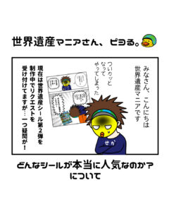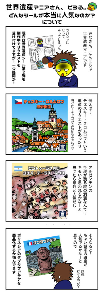 4コママンガ「世界遺産マニアさん、ピヨる。」どんなシールが本当に人気なのか?について 2026 4/26 世界遺産マンガ シール 漫画 URLをコピーしました!自分なりに分析してみましたが…変な自信が! 世界遺産マンガ シール 漫画 この記事が気に入ったら いいね または フォローしてね! Follow @sekaiisan_mania Follow Me URLをコピーしました! この記事を書いた人 世界遺産マニア(の中の人) 世界遺産マイスター|WHA認定講師 世界遺産一筋20年以上!遺跡を求めて世界を縦横無尽で駆け抜ける、生粋の世界遺産マニアです。そんな「世界遺産マニア」が運営するこちらのサイトは1200以上もある遺産の徹底紹介からおもしろネタまで語り尽くし、漫画からオリジナルシールまで制作・公開しています。 関連記事 世界遺産シール「シバームの旧城壁都市」 2025年9月24日 4コママンガ「世界遺産マニアさん、ピヨる。」ピラミッド編 2025年7月27日 4コママンガ「ツタンカーメンさんは死ねない。」私の旅券について 2025年12月12日 世界遺産シール「ペルシャ式庭園」 2025年10月3日 世界遺産シール「ヴェネツィアとその潟」 2025年8月10日 世界遺産シール「ローマ歴史地区、教皇領とサン・パオロ・フオーリ・レ・ムーラ大聖堂」 2025年5月29日 4コママンガ「瀬戸際のシロヤナギちゃん・ノケモン編」ゲスト・フラフラ〜ルおばさん 出現編 2026年2月7日 世界遺産シール「ブリュッセルのグラン=プラス」 2025年7月24日