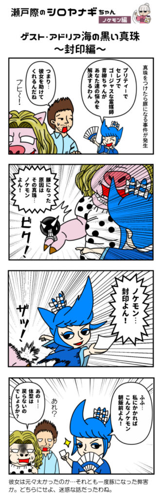 少し変わった髪型の霊媒師見習いの白柳(シロヤナギ)ちゃん。彼女には世界中の「ノケモン」と呼ばれるモンスターを封印するという使命が。今回は青柳ちゃんがアドリア海の真珠の悪さをこらしめるものの…??