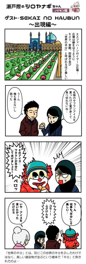 少し変わった髪型の霊媒師見習いの白柳(シロヤナギ)ちゃん。彼女には世界中の「ノケモン」と呼ばれるモンスターを封印するという使命が。今回は「世界の半分」と称されたエスファハーンを訪れるが…またとんでもないノケモンが!?