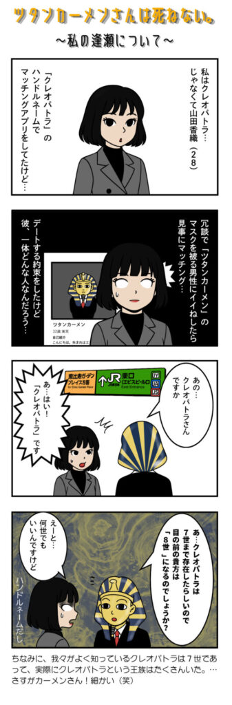 4コママンガ「ツタンカーメンさんは死ねない。」私の逢瀬について
