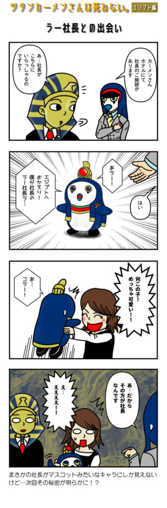 3000年以上も生き続けるツタンカーメンさんはミイラであっても肉体を維持するために死ぬわけにはいかない。今回はカーメンさんを招待したヘリオポリス社の社長から挨拶があるらしいが…まさかの人物が!?