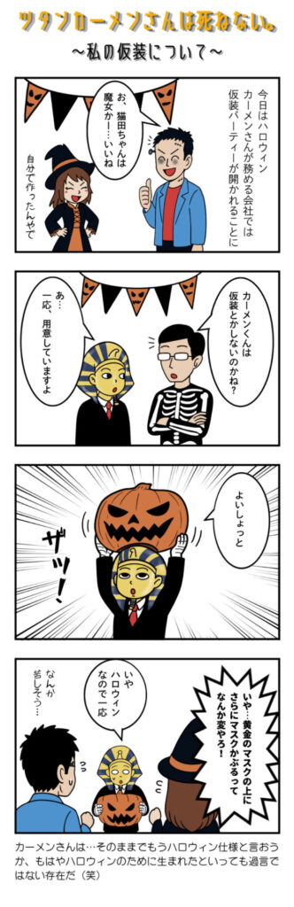 3000年以上も生き続けるツタンカーメンさんはミイラであっても肉体を維持するために死ぬわけにはいかない。今回はハロウィンパーティーに参加するカーメンさんだったが、彼の仮装が物議を醸すぞ…!