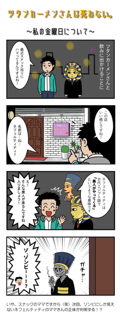 3000年以上も生き続けるツタンカーメンさんはミイラであっても肉体を維持するために死ぬわけにはいかない。今回はなんと後輩と飲みに行くのだが、場末のスナックがまさかの…!?