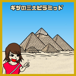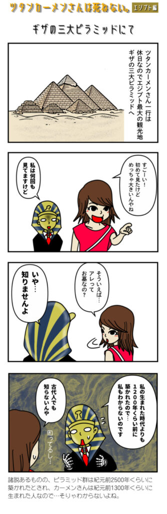4コママンガ「ツタンカーメンさんは死ねない。」ギザの三大ピラミッドにて