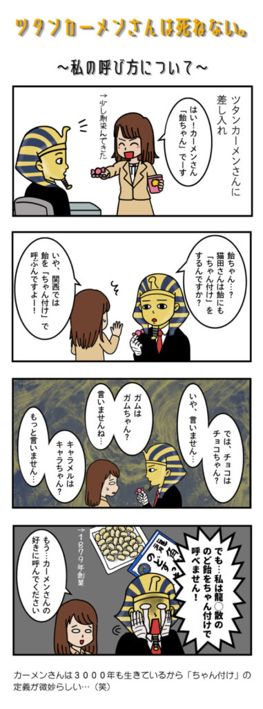 3000年以上も生き続けるツタンカーメンさんはミイラであっても肉体を維持するために死ぬわけにはいかない。今回は猫田さんが飴を差し入れるも、その呼称が気になってしまう…。