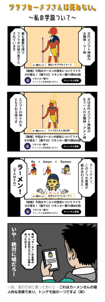 3000年以上も生き続けるツタンカーメンさんはミイラであっても肉体を維持するために死ぬわけにはいかない。今回はYouTuberのカーメンさんがラーメンの歴史を語ってくれるが…これ本当なの?