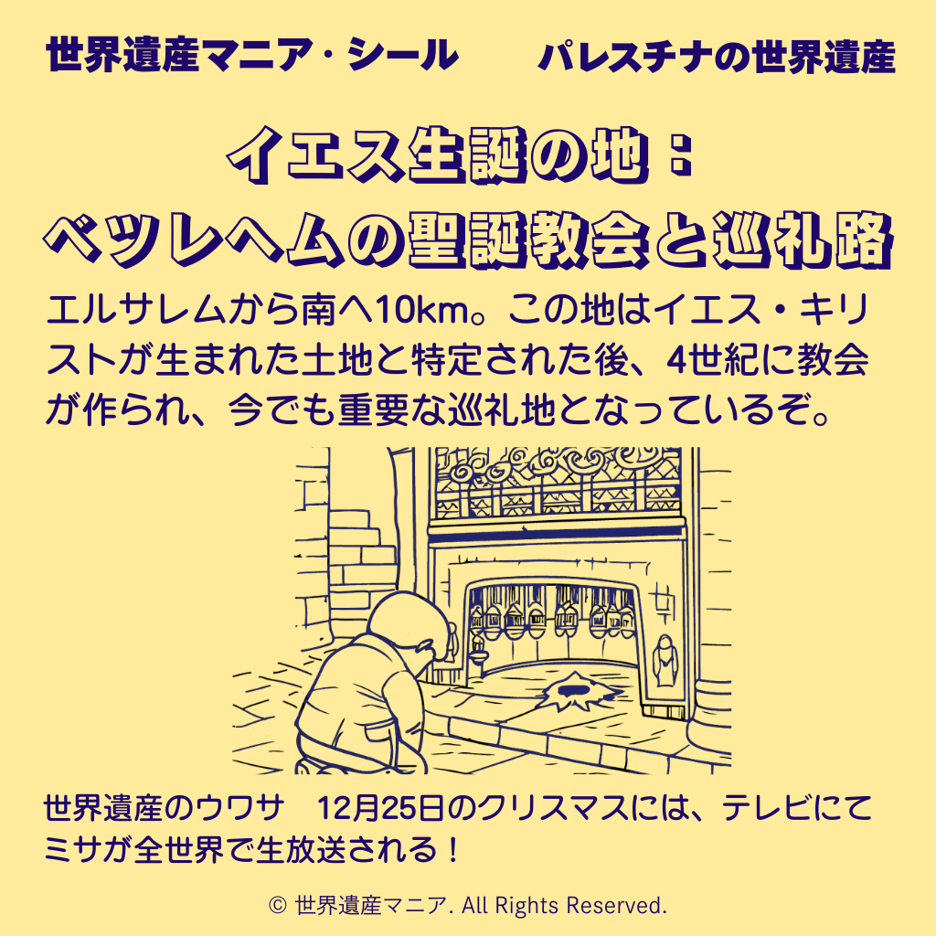 エルサレムから南へ10km。この地はイエス・キリストが生まれた土地と特定された後、4世紀に教会が作られ、今でも重要な巡礼地となっているぞ。