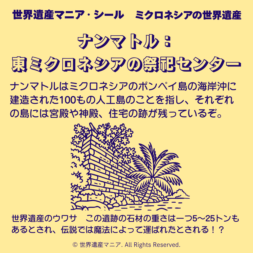 ナンマトルはミクロネシアのポンペイ島の海岸沖に建造された100もの人工島のことを指し、それぞれの島には宮殿や神殿、住宅の跡が残っているぞ。