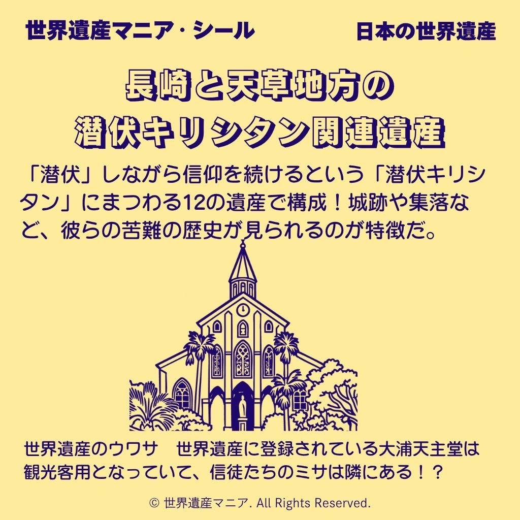 「潜伏」しながら信仰を続けるという「潜伏キリシタン」にまつわる12の遺産で構成!城跡や集落など、彼らの苦難の歴史が見られるのが特徴だ。