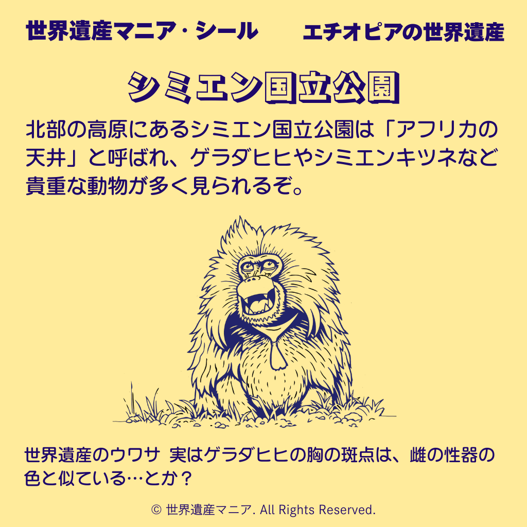 北部の高原にあるシミエン国立公園は「アフリカの天井」と呼ばれ、ゲラダヒヒやシミエンキツネなど貴重な動物が多く見られるぞ。