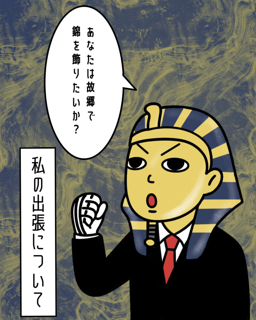 4コママンガ「ツタンカーメンさんは死ねない。」私の出張について